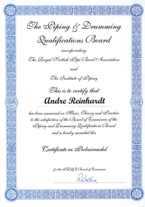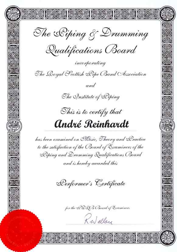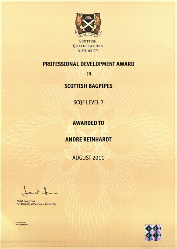 In Schottland absolviere ich auch die Examen für die Zertifikate der Scottish Qualifications Authority (SQA) und des Piping and Drumming Qualifications Boards (PDQB), von denen es nach SCQF 8 Level mit ansteigendem Schwierigkeitsgrad gibt. Das zweithöchste Zertifikat habe ich bereits 2011 erhalten. Mehr Infos zu den Dudelsackzertifikaten finden Sie hier.